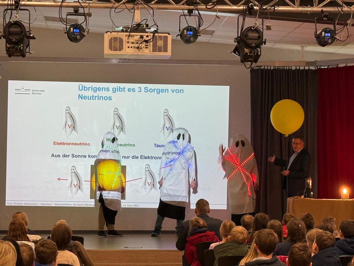 Ein Beispiel ist die Kinder-Uni „Neutrinos – Geisterteilchen, die durch Wände gehen" vom 14. März 2025. In dem Vortrag drehte sich alles um die sogenannten Neutrinos, die häufigsten Teilchen im Universum. Prof. Dr. Christian Weinheimer der Universität Münster gab Einblicke in das Verhalten der kleinen Teilchen.