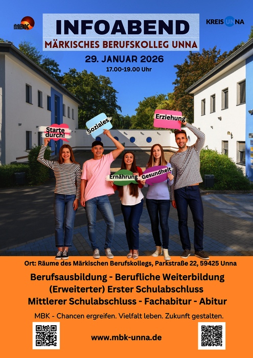 Auf dem Informationsabend erhalten Sie Informationen über die Bildungsgänge und Abschlüsse, die am Märkischen Berufskolleg Unna absolviert werden können.